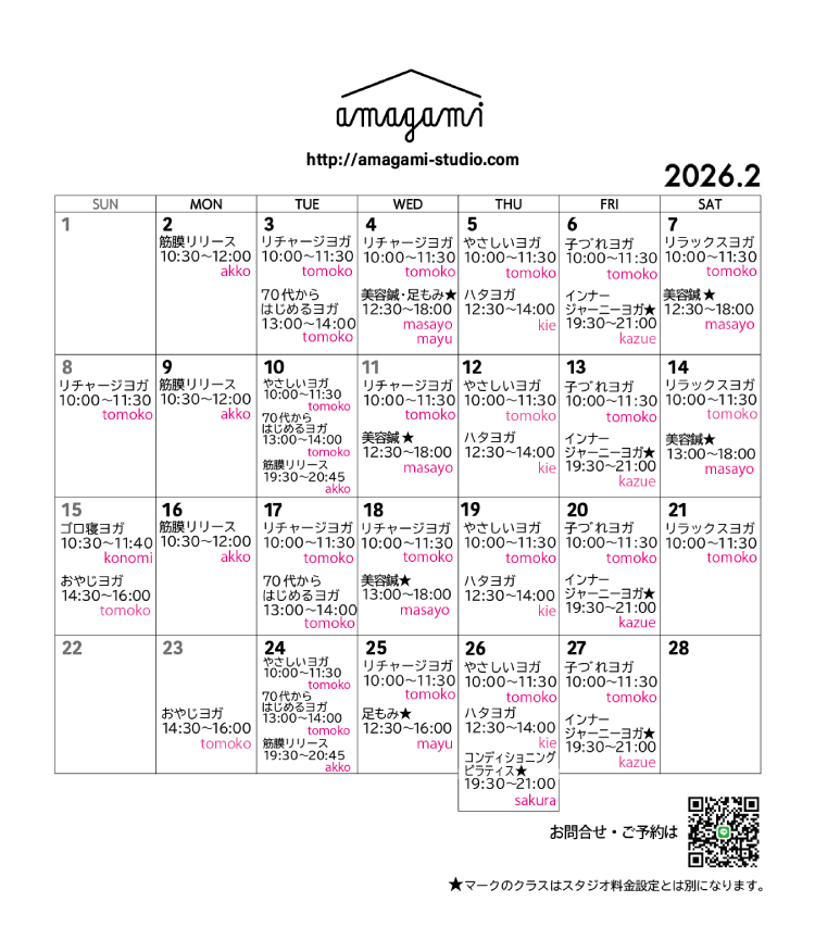 各クラス詳細はhttp://amagami-studio.com/yoga_class